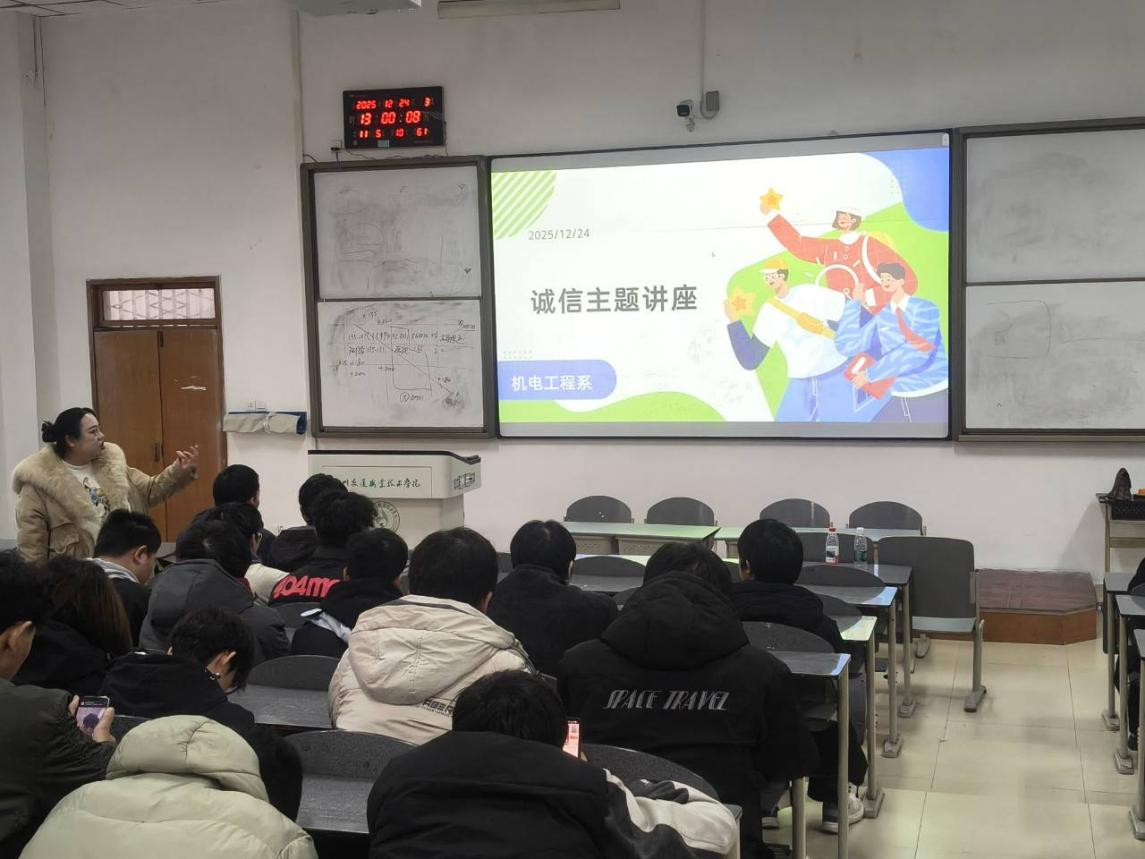 2025年12月24日,机电工程系在励学楼2119开展了“以诚立身,以信致远——做新时代诚信大学生”主题活动。全校共有108名同学参加,为此我们请来了机电系唐佳书记来了为大家开展本次机电系诚信主题讲座活动。